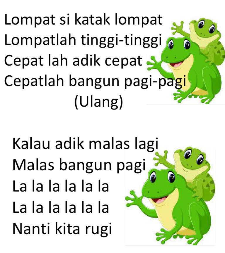 Pendidik akhiri aktiviti dengan mengucapkan terima kasih kepada kanak-kanak. Pendidik ulang lagi aktiviti hingga kanak-kanak merasa puas. LOMPAT SI KATAK LOMPAT Animasi LirikLompat si katak lompatLompatlah tinggi-tinggiCepatlah adik cepatCepat bangun pagi-pagiKalau adik malas lagiMalas bangun.