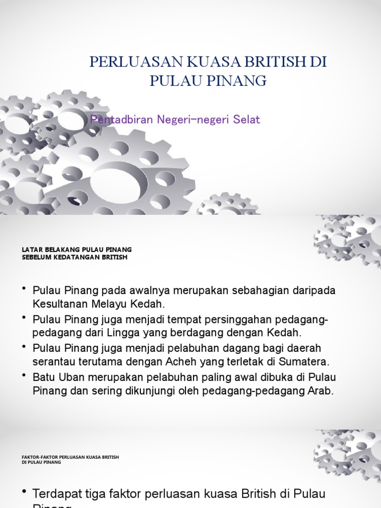 British dalam pelayaran dari Pulau Pinang ke Melaka dirompak berdekatan perairan Kuala Langat. Pengukuhan Kuasa British di Pulau Pinang. Poorush SdnBhd presents Perluasan Kuasa British di Pulau Pinang TOPIC 1 Kedudukan Strategik Pulau Pinang Kedudukan Pulau Pinang di pertengahan laluan perdagangan di antara Timur dan Barat dapat memenuhi keperluan seperti.